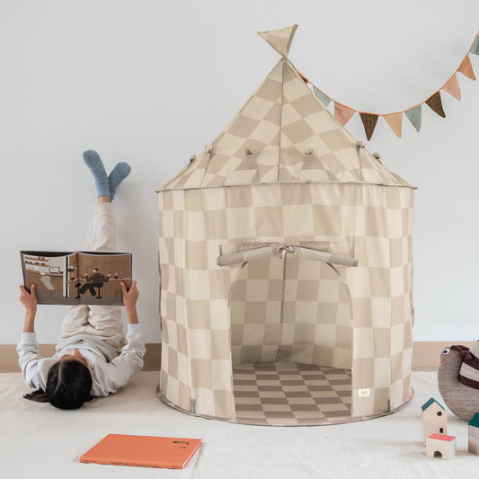 checkerboard beige recycled fabric play tent